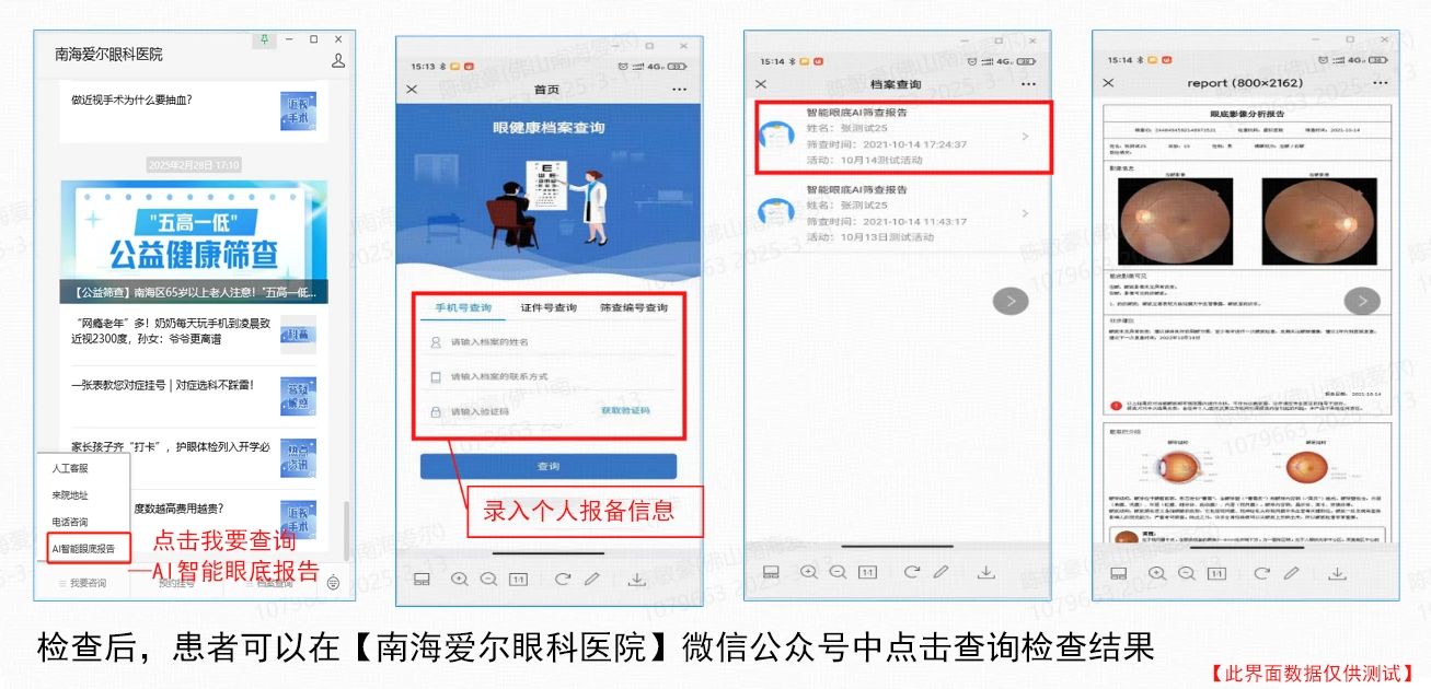 检查者可以关注南海爱尔眼科医院或者南海爱尔眼科公众号,点击我要查询中的AI智能眼底报告,输入个人信息领取个人眼底检查报告。