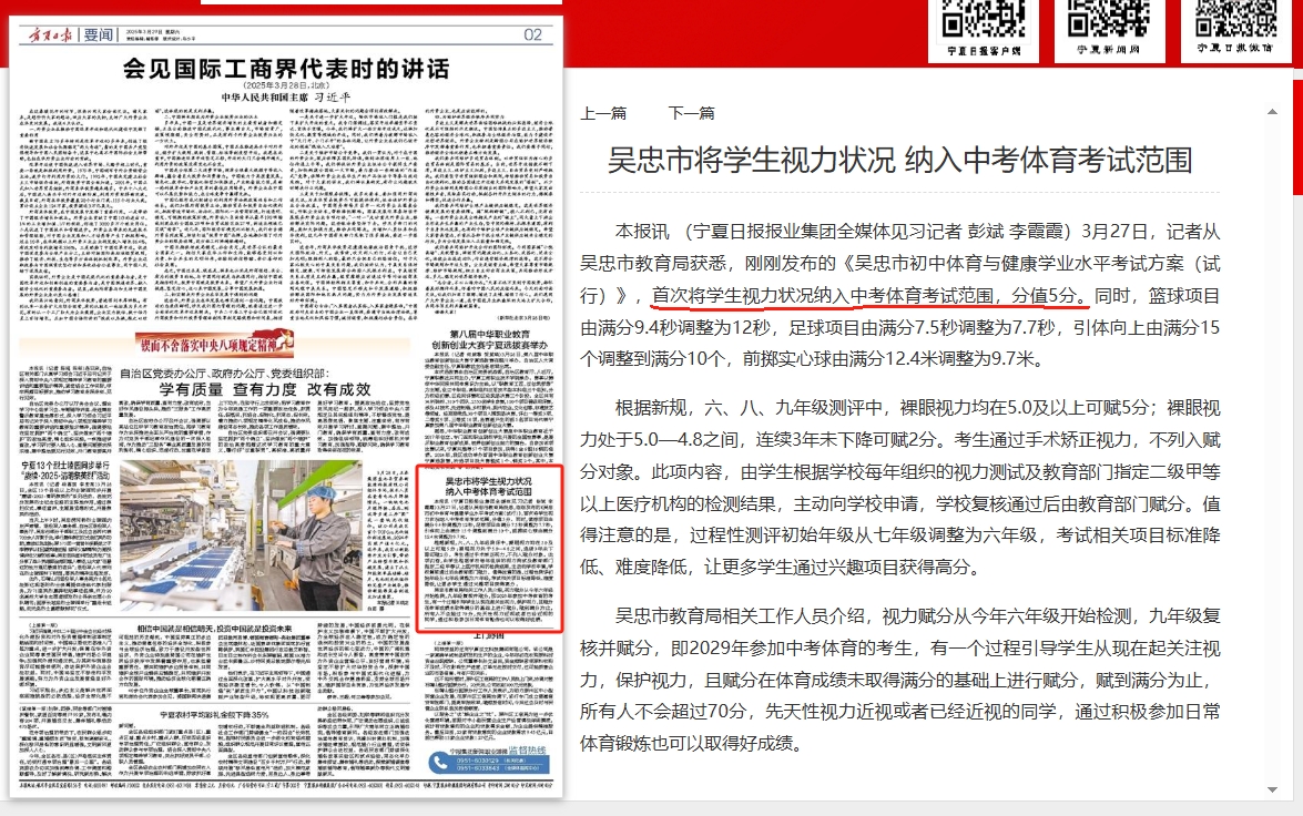 近日,一则关于“2025年将孩子视力状况纳入中考评价体系”的消息,在我国教育界和家长圈中引发了广泛讨论,这一前所未有的改革措施不仅触动了万千家庭敏感的神经,更引发了我国社会各界对教育评价体系未来走向的深刻思考。 尽管教育部已明确目前无全国性政策推行,但我国部分地区正积极探索将视力健康纳入学生综合素质评价体系。南海爱尔眼科医院视光及小儿眼病科唐永哲提醒广大家长:近视防控需趁早,科学防护刻不容缓。 云南省自2020年率先将视力指标纳入中考体育考核,宁夏吴忠市2025年试点方案更对视力健康单独赋分5分,通过持续追踪学生三年视力变化进行动态评估。此类探索虽处试点阶段,却折射出我国对学生体质健康管理的升级趋势。 值得关注的是,《普通高等学校招生体检工作指导意见》明确规定,48个专业对考生视力存在硬性要求。某省警校2022年招录数据显示,因视力不达标导致的淘汰率高达23%,印证了"视力健康=未来选择权"的现实命题。 (图片来源:宁夏日报) "六年级近视度数超过600度的孩子,成年后发生视网膜病变的风险将增加10倍。"南海爱尔眼科视光学科主任唐永哲指出,"近视防控本质是致盲性眼病的源头干预,需建立'监测-预警-控制'三级防御体系。"临床数据显示,眼轴长度每增长1mm,近视度数约增加200-300度,而不可逆的眼轴增长正是高度近视并发症的核心诱因。 那么,作为家长,该如何保护孩子的视力呢? 科学防控近视,除了增加孩子白天户外活动的时间外,还要养成良好的用眼习惯。如避免长时间近距离用眼,保持正确的读写姿势,防止在光线不足或过于强烈的环境下用眼,确保充足的睡眠以缓解眼部疲劳。 此外,作为孩子近视防控的“守门人”, 家长一定要关注孩子近视发展四个阶段, 带孩子做好“四查一建档”。